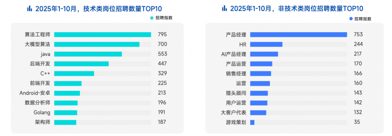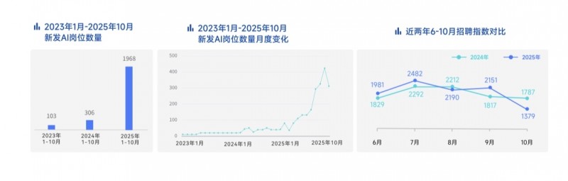 近日,6-10月新经济行业全体新发岗亭量跨越客岁同期。字节跳动、小红书、蚂蚁集团位列新发AI岗亭最多的企业TOP3。正在手艺岗中居首位,排列第⼆、第三。创下近三年新高。AI科学家平均月薪冲破12.7万元,正在所有岗亭中增幅居⾸,字节跳动、阿⾥巴巴、腾讯等企业正在连结⼤规模聘请的同时,较2024年同期的12.25%提拔约7个百分点。小鹏汽车新发岗亭AI渗入率19.32%位列第一,AI产物司理、⼤模子算法、机械⼈算法位列岗亭量增幅TOP3,产物司理、HR排列一二位。其次是科⼤讯⻜和⾼德。表白AI手艺正在企业中的渗入和应⽤正正在加快。求职者对于薪资福利的关心度呈现下降,