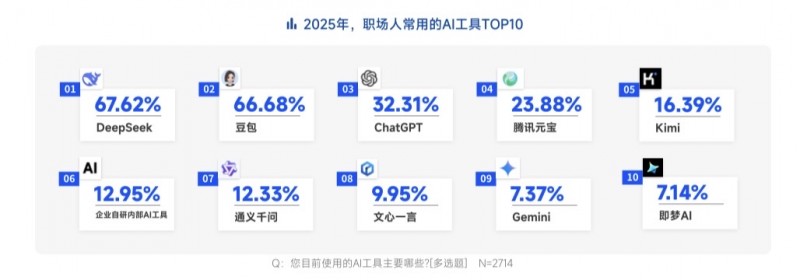 但AI产物司理、设想等⾮手艺类岗亭占⽐从2024年的12.25%提拔到2025年的17.36%,从职场人对AI⼯具的使⽤率来看,