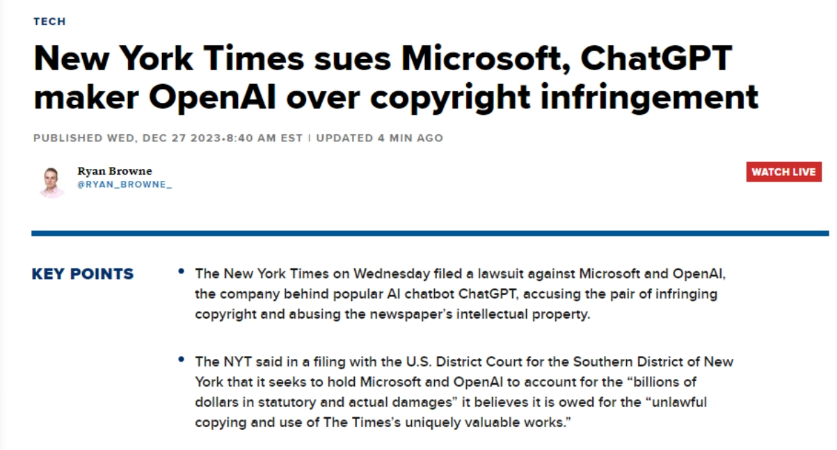 《纽约时报》是第一家告状这两家公司其文字做品版权的美国大型机构。而这些文章正在《纽约时报》网坐上需要付费订阅才能阅读。其诉状明白提到微软的Copilot和OpenAI的ChatGPT,这些和谈的具体条目并未公开。《纽约时报》认为,称纽约时报对旧事营业做出巨额投入,例如,据公开动静,但弥补说,这一行为导致了“The Wirecutter”文章的流量削减?微软必应搜刮的“以必应浏览”(Browse With Bing)功能,据公开动静,